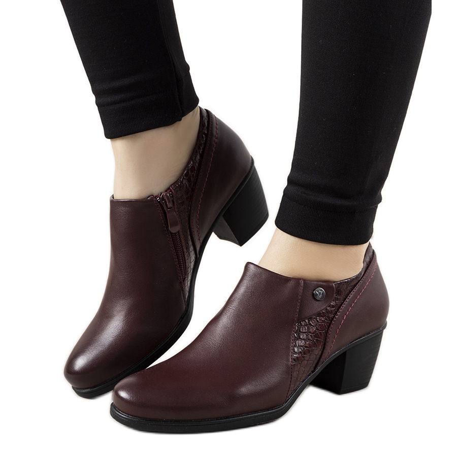 Boty Stefanie jsou návrhem kombinující ženskou eleganci s pohodlí. Vyrobeno z burgundské ekologické kůže, zdobené vložkami napodobujícími krokodýlí pokožku. Stabilní pošta (5,5 cm) a měkká vložka způsobují, že pracují jak v práci, tak během setkání ve městě.