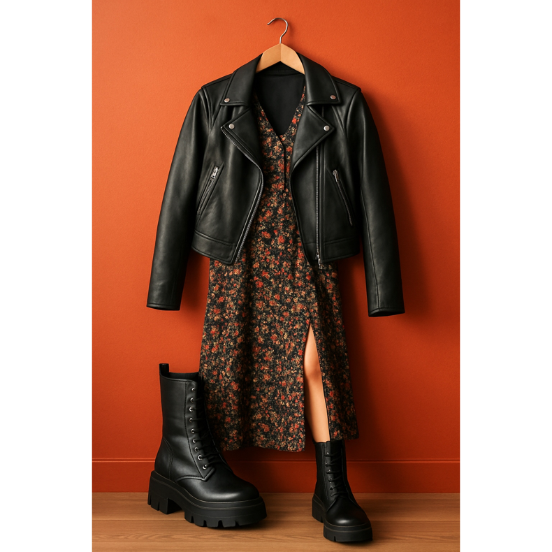 Kombinace těžkých dělnických kozaček s jemnými květinovými šaty je klasika, která se vždy hodí. Vyberte si midi nebo maxi šaty s rozparkem, který odhalí svršek boty. Přidejte koženou motorkářskou bundu nebo oversized bundu. Tato sada je dokonalou rovnováhou mezi rockovým stylem a romantickým dívčím stylem. Nezapomeňte to s doplňky nepřehánět – boty jsou zde dostatečně výrazným akcentem.