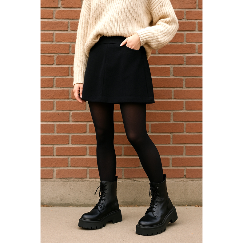 Masivní kozačky vypadají skvěle i s krátkými minisukněmi. Abyste předešli vulgárnímu efektu, zvolte tlusté, černé punčochové kalhoty (neprůhledné) a volnější top, např. tlustý pletený svetr částečně zastrčený za páskem. Silná podrážka opticky zeštíhluje nohy a vysoký svršek dodává charakter. To je perfektní styl pro podzimní procházky nebo setkání s přáteli.