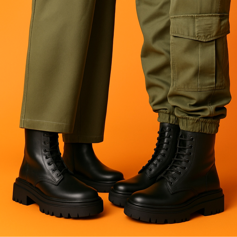 Pokud dáváte přednost kalhotám, robustní kozačky vypadají nejlépe s modely s rovnými nebo širokými nohavicemi, které mírně spadají přes botu, ale nezakrývají ji úplně. Můžete si také zastrčit kalhoty (vojenský styl), pokud máte cargo kalhoty nebo joggery. Vyhněte se jejich kombinaci s velmi těsnými trubičkami, pokud nechcete dosáhnout efektu „tyčinky v botě“.