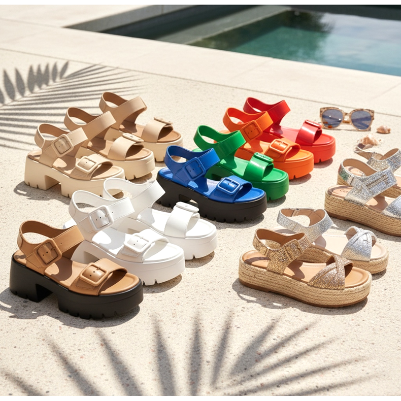 Barvy masivních sandálů pro léto 2026 jdou dvěma směry. Prvním trendem jsou neutrální barvy – béžová, ecru, písková, bílá a černá. Tyto odstíny jsou nejuniverzálnější a snadno se upravují.
