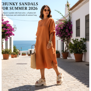 Masivní sandály s širokými nohavicemi jsou hitem léta 2026. Zrcadlové šaty nebo vzdušné plátěné kalhoty dokonale ladí se silnou podrážkou a vytvářejí vyvážený módní vzhled. Pamatujte, že délka nohavic by měla dosahovat ke kotníku nebo být mírně vyhrnutá, aby byly boty vidět.