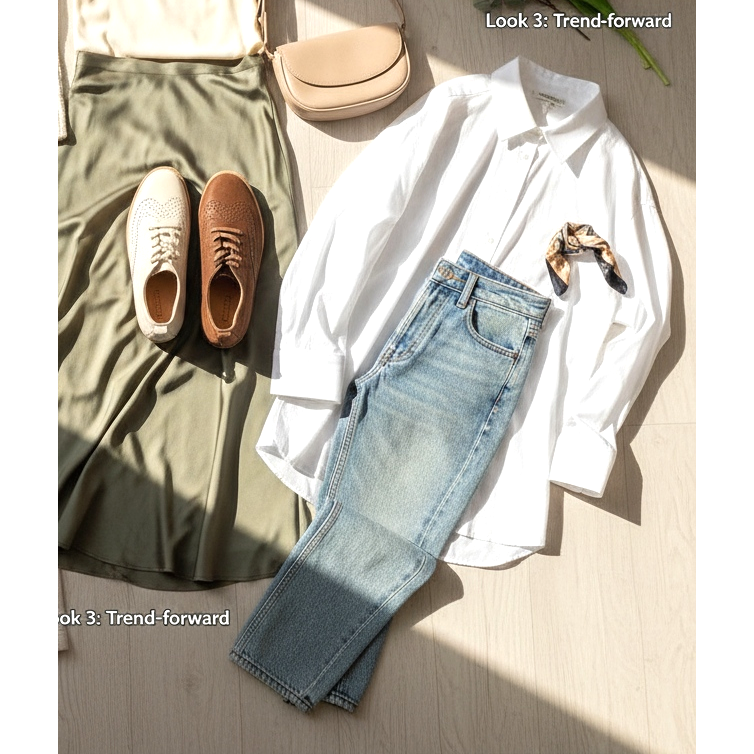 Pohled 3 – Trend vpřed: Krémové měkké derby + vintage džíny (lehce vybledlé, kolem pasu) + oversized bílá košile zastrčená do kalhot. Pařížský efekt, neokázalý, elegantní.