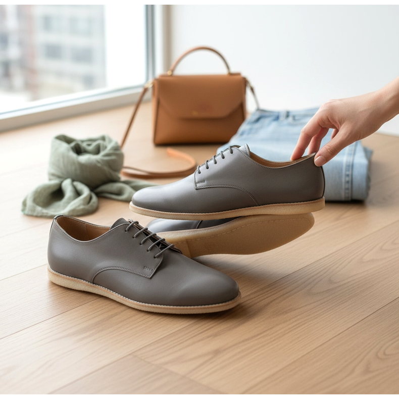 Vzhled 1 – Neformální minimalistický: Krémové jemné derby + široké plátěné kalhoty v ovesné barvě + příjemný šedobílý svetr. Je to vzhled, který vypadá jako milion dolarů, ale ve skutečnosti je velmi jednoduchý.