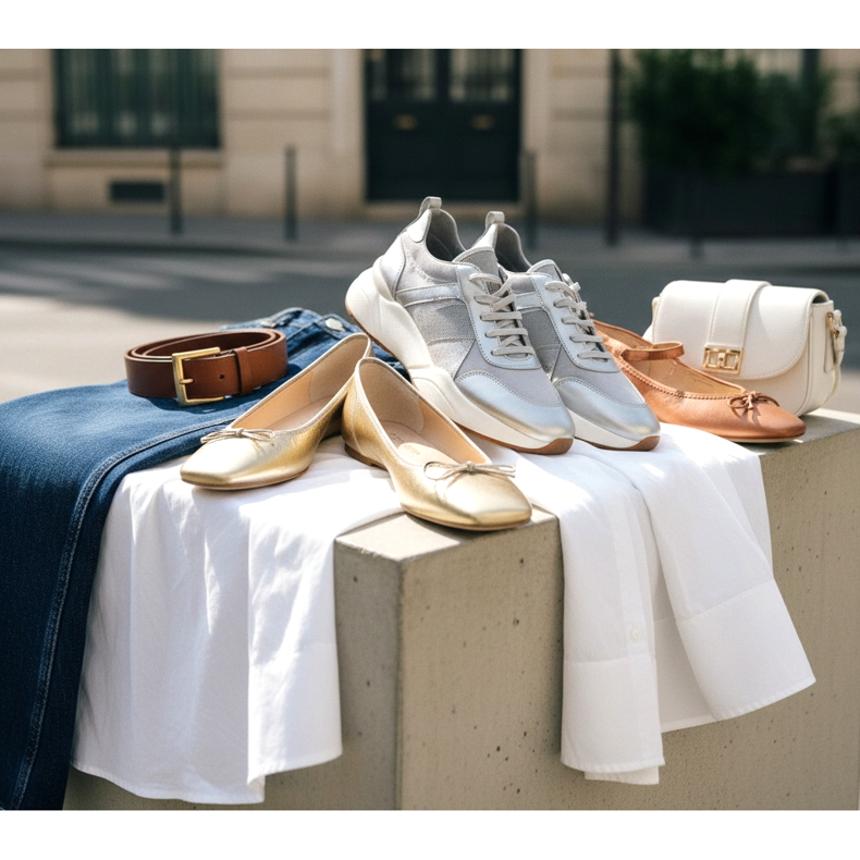 Vyzkoušejte zlaté placky s tmavou džínovinou a jednoduchou bílou košili. Přidejte kožený pásek a minimalistickou kabelku - efekt je překvapivě luxusní a přitom naprosto pohodlný. Stříbrné balerínky dokonale doplňují monochromatické styly v šedé a bílé.