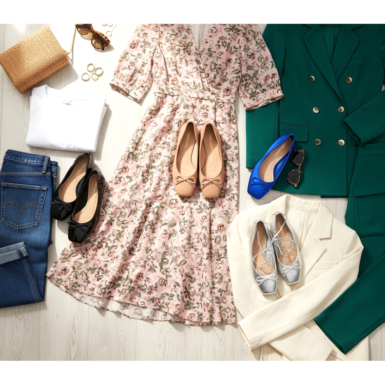 K jarním šatům - zvolte nahé nebo světle béžové balerínky s květinovými midi šaty. Tato kombinace vytváří nepřerušovanou vertikální linii, díky čemuž nohy vypadají opticky delší. K šatům v intenzivní barvě (kobalt, smaragd) volte balerínky v neutrální barvě, které nebudou konkurovat vašemu oblečení.