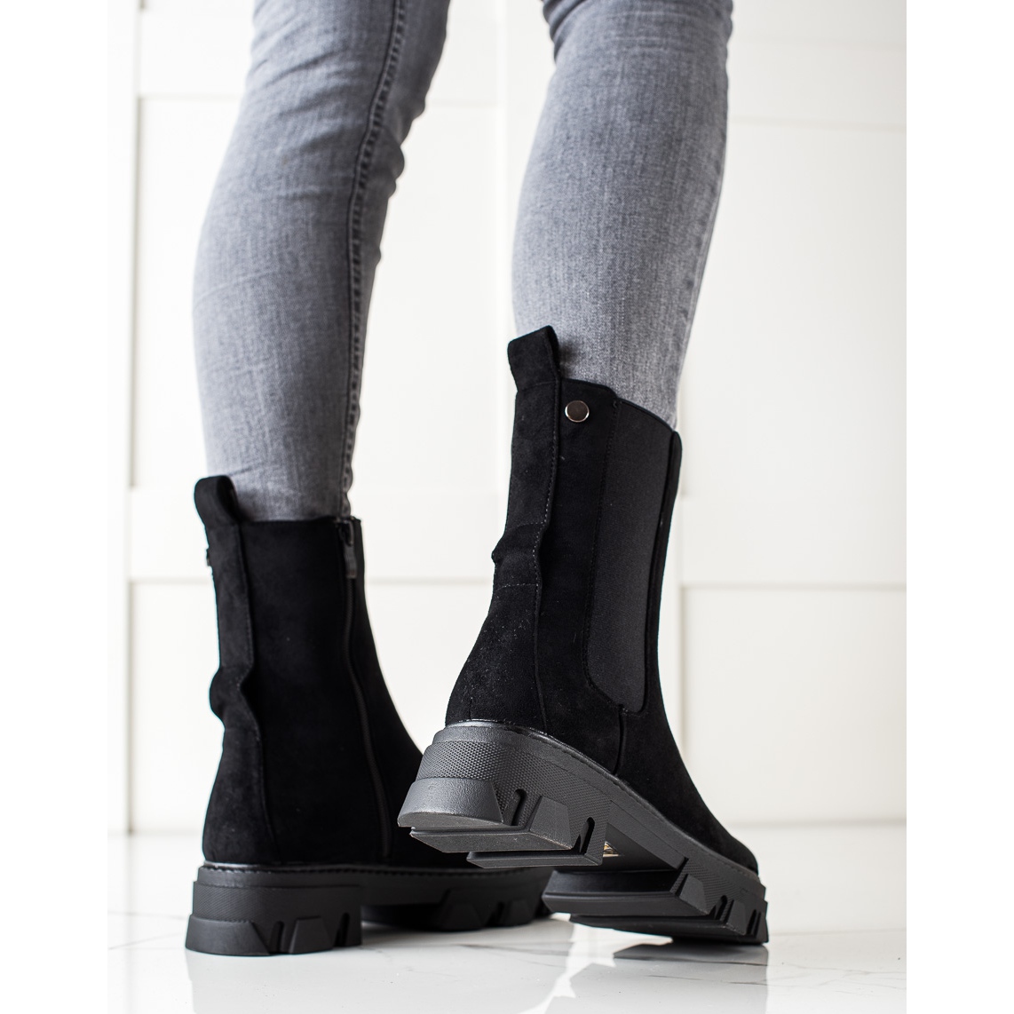 Tyto elegantní černé kozačky se vyznačují zvýšeným měkkým podpatkem, který zajišťuje nejen pohodlí při nošení, ale také dokonalé přizpůsobení noze. Jsou vyrobeny z imitace semiše, vypadají stylově a díky jejich minimalistickému designu se snadno kombinují s různými ležérními styly.