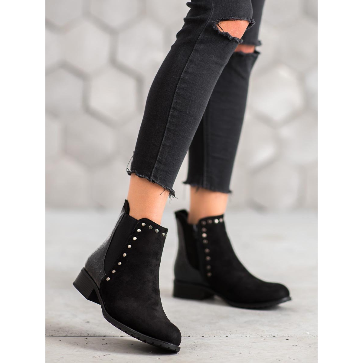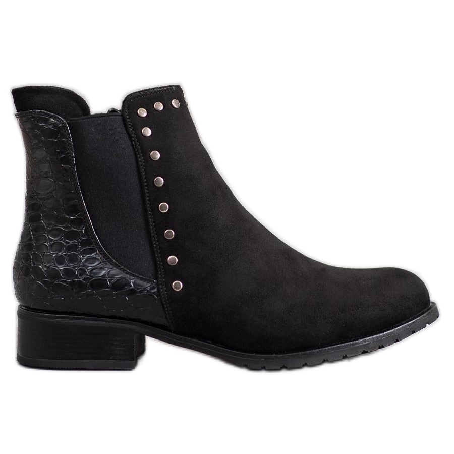 Zde je perfektní volba pro každou ženu, která chce spojit módu s pohodlím – módní černé kotníkové boty SHELOVET. Tyto originální kotníkové boty jsou perfektním doplňkem mnoha každodenních stylů a zároveň zajišťují pohodlí při nošení. Svršek z semišového materiálu podobného kůži, zdobený stříbrnými kamínky, přitahuje pozornost a dodává botám jedinečný charakter. Zadní část kozaček s motivem krokodýlí kůže dodává punc elegance a stylu.