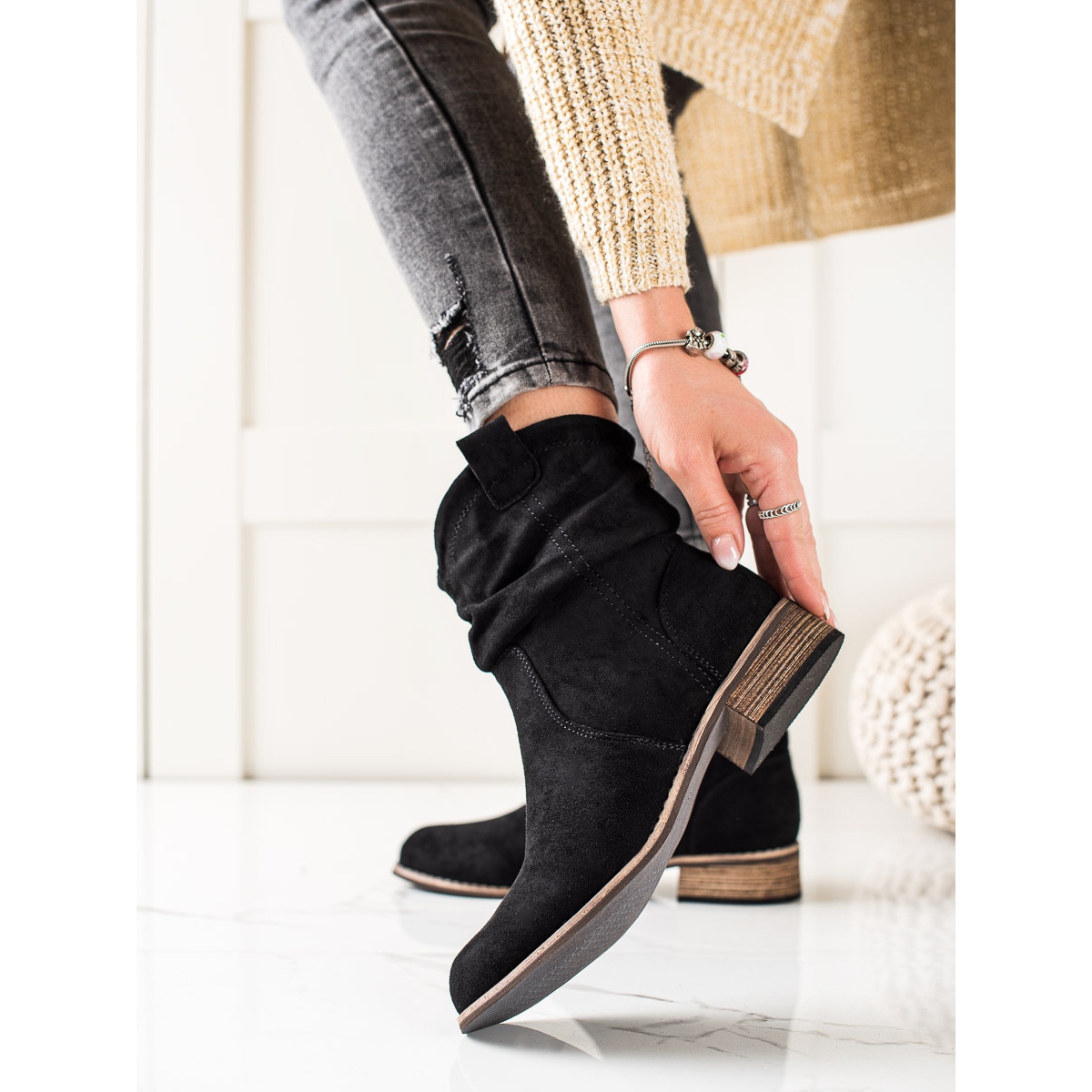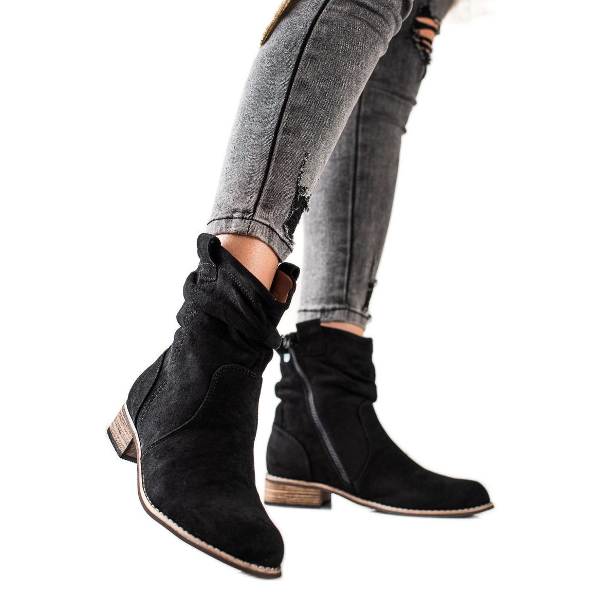 Horní výška je 15 cm, což znamená, že boty dosahují nad kotník a dobře chrání nohy před chladem. Jsou vyrobeny z ekologické semišové kůže, mají kulatou špičku, která dodává jemnost.