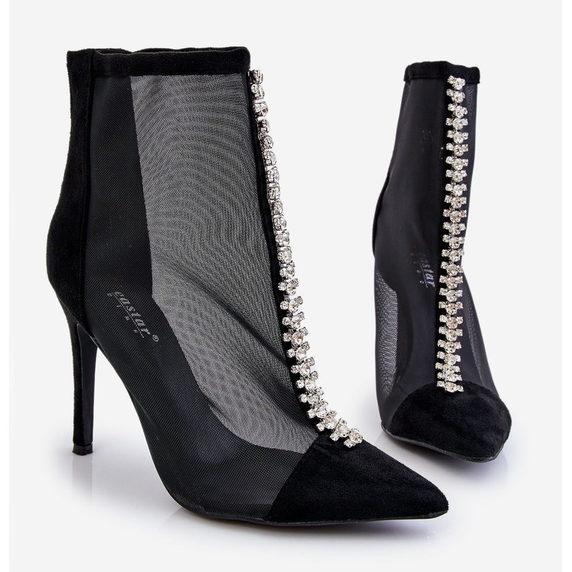 Módní ženské boty na vysokých podpatcích Rummi - černá, smyslná a elegantní. Kombinace měkkého ekologického semiše s otevřenou sítí jim dává lehkost a moderní charakter a lesklé kamínky napodobující kamínky jemně zdůrazňují přední část horního. Štíhlý nos ve Spitz a vysoký patch špendlíku opticky štíhlé nohy a vytváří efektivní, večerní vzhled.