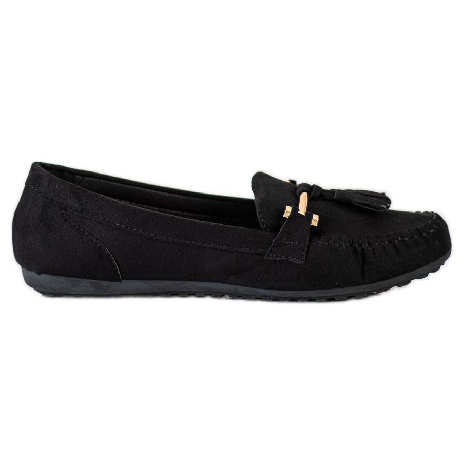 Tyto černé mokasíny vyrobené z vysoce kvalitní imitace semiše jsou nejen estetické, ale také praktické. Podešev s plastovým nášlapem poskytuje vynikající přilnavost, což z nich dělá ideální volbu pro jarní a letní dny. Originální třásně jim navíc dodávají charakter, díky čemuž jsou jedinečným prvkem jakéhokoli stylingu.