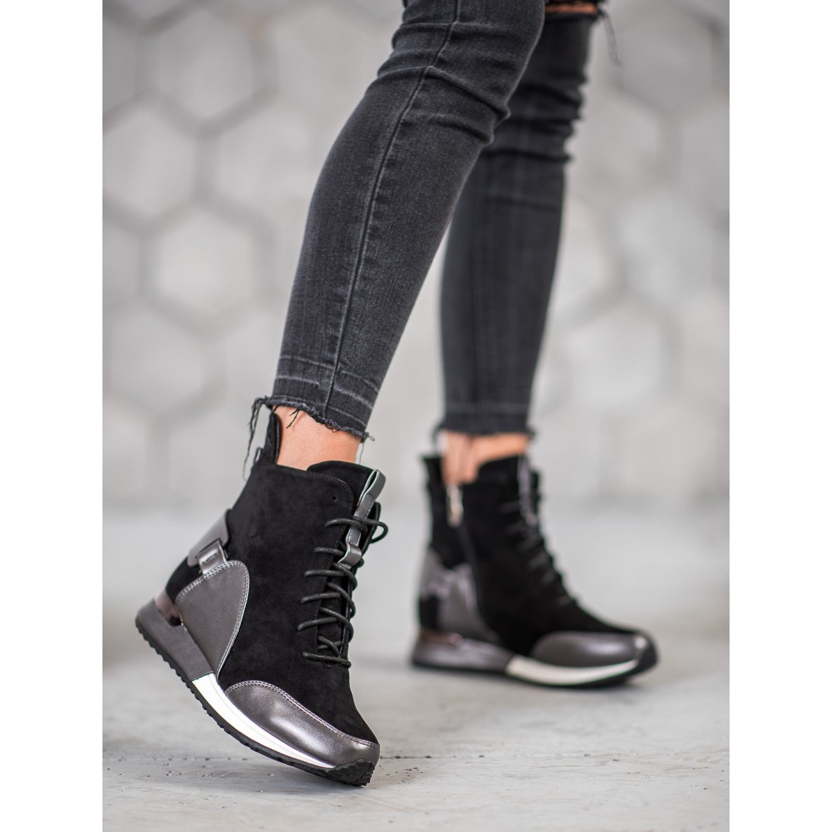 Tyto boty se zapínáním na tkaničky a zip jsou nejen praktické, ale také vypadají výjimečně stylově. Díky kulaté špičce a vestavěné měkké patě jsou pohodlné a pohodlné po celý den. Gumová podrážka s běhounem poskytuje dobrou přilnavost, díky čemuž jsou ideální pro každodenní i sportovní styling.