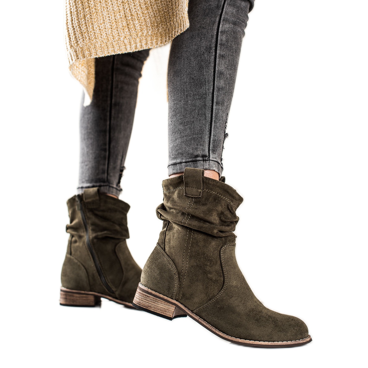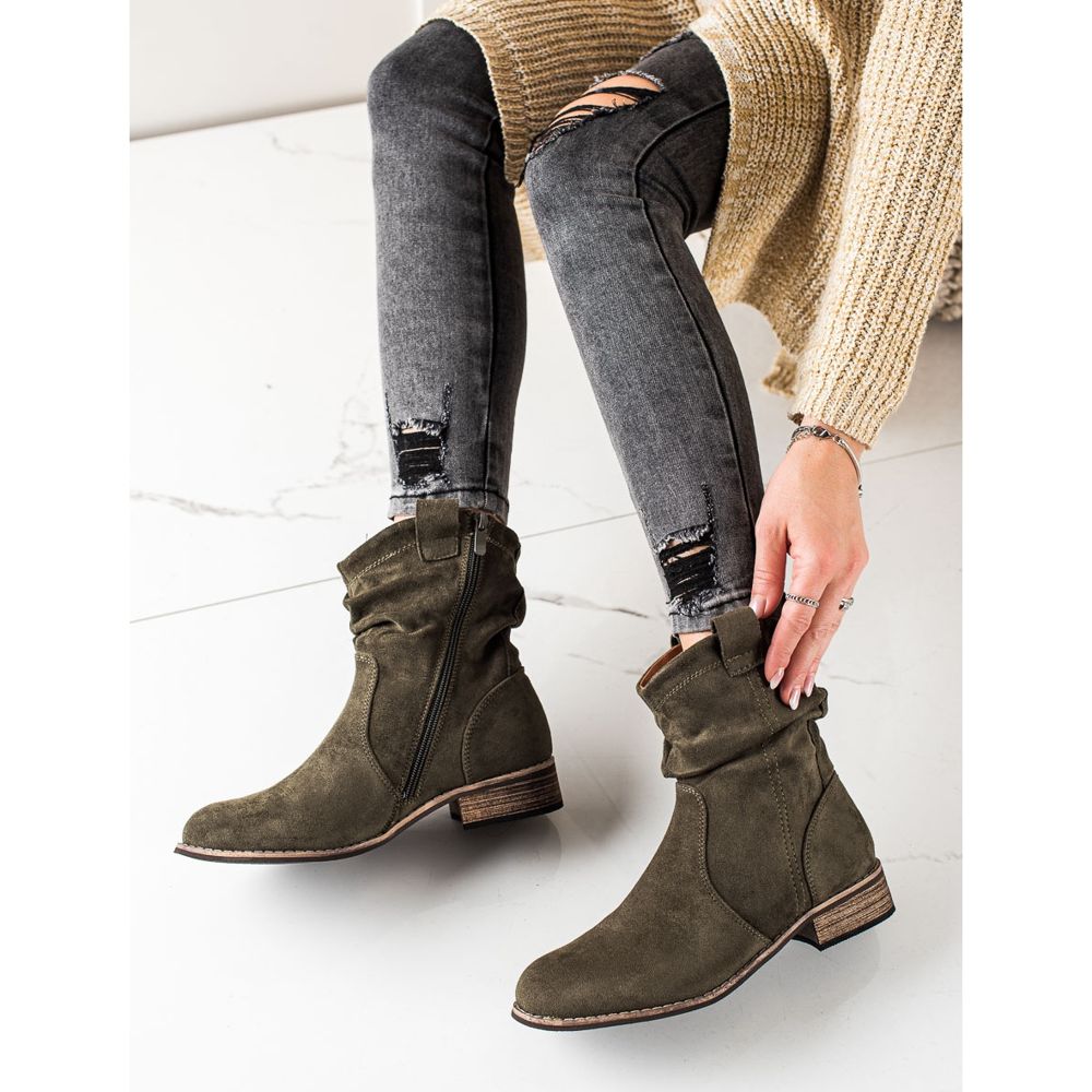 Představujeme elegantní a stylové kovbojské boty Event, které se perfektně hodí k módním trendům podzimní/zimní sezóny. Tyto módní zelené kozačky jsou perfektní volbou pro ženy, které oceňují pohodlí a originální design. Jsou vyrobeny z ekologické semišové kůže, vypadají mimořádně atraktivně a díky kulatému nosu se pohodlně nosí.
