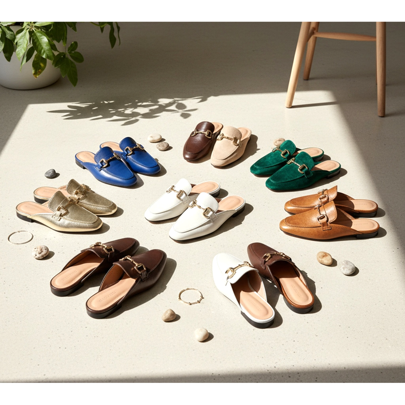 Mule mokasíny existují v několika variantách, které se liší výškou podpatku, materiálem a stylem. Každý z nich má svůj jedinečný charakter.