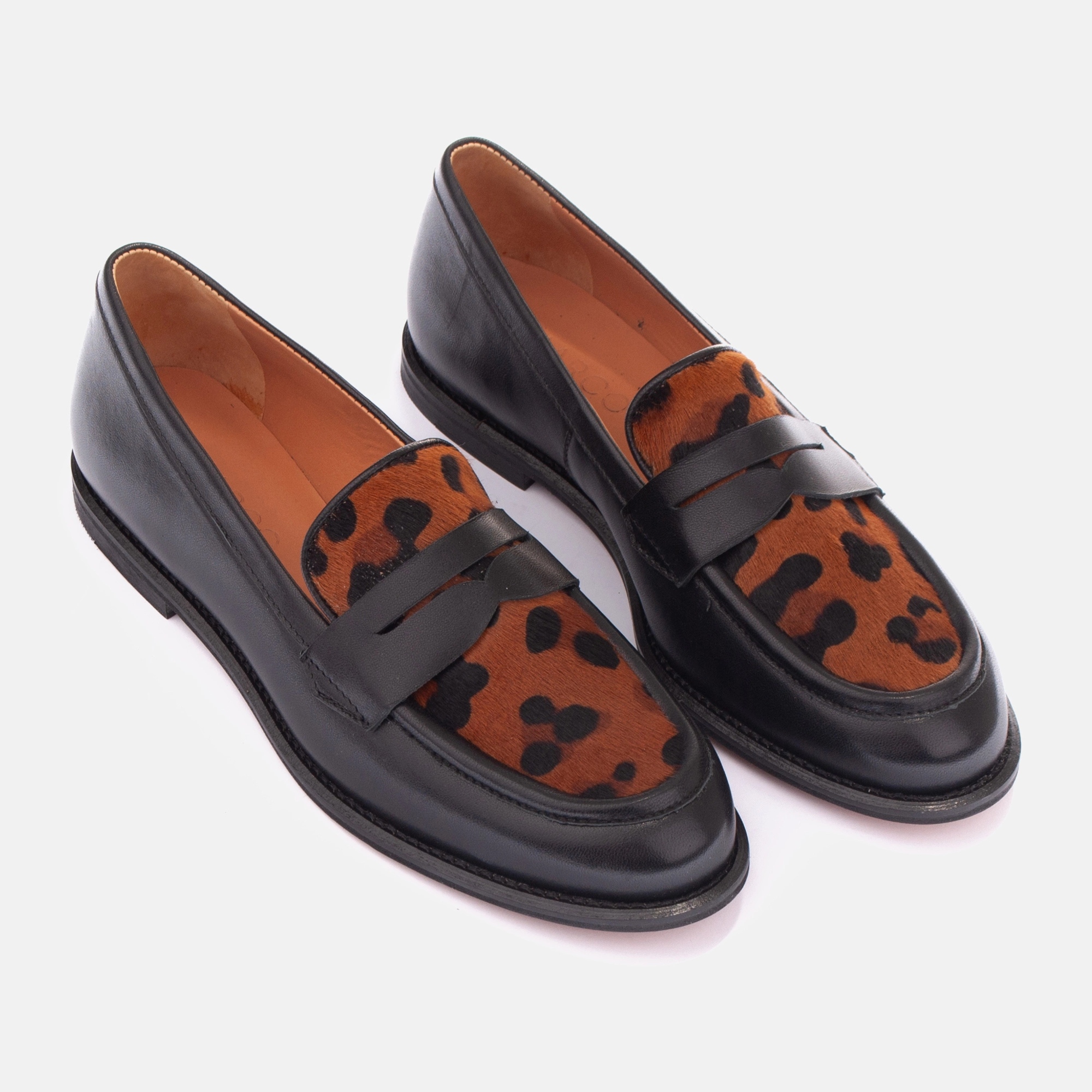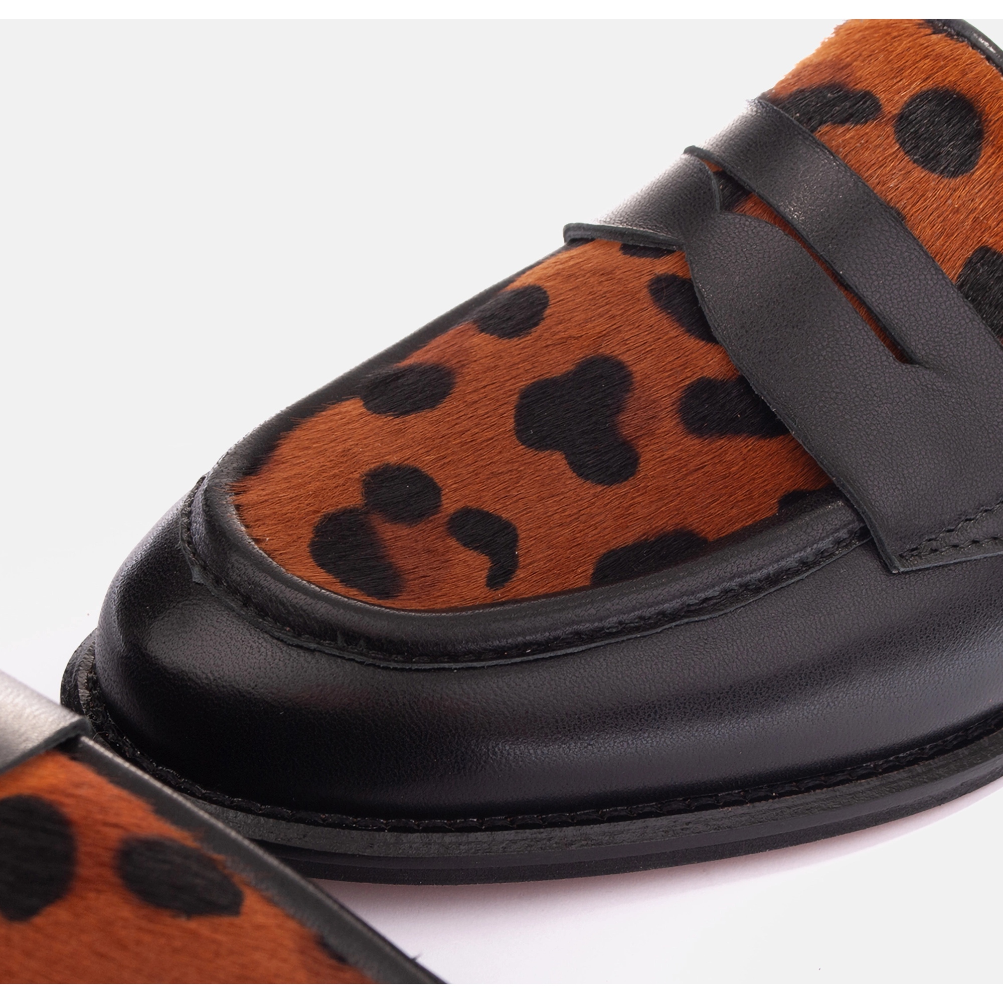 Představujeme Lorenzo Pony Loafers od renomovaného výrobce Marco Shoes - ideální volbu pro ženy, které si cení elegance a pohodlí. Tyto černé mokasíny, zdobené hnědým přízvukem ve vzoru zvířat, dokonale zapadají do nejnovějších módních trendů a přidávají charakter jakékoli stylizace.