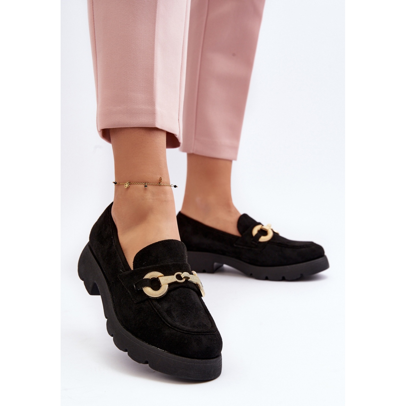 Nosy Moccasin jsou zaoblené, což jim nejen dává jemný vzhled, ale také poskytuje pohodlí při nošení. Na přední straně je velkolepá zlatá dekorace ve formě řetězu, který upoutal oko a přidává postavu do bot. Plochý pata 4 cm a platforma 2 cm je dělá každý den pohodlnými a zároveň opticky prodlužuje nohy.