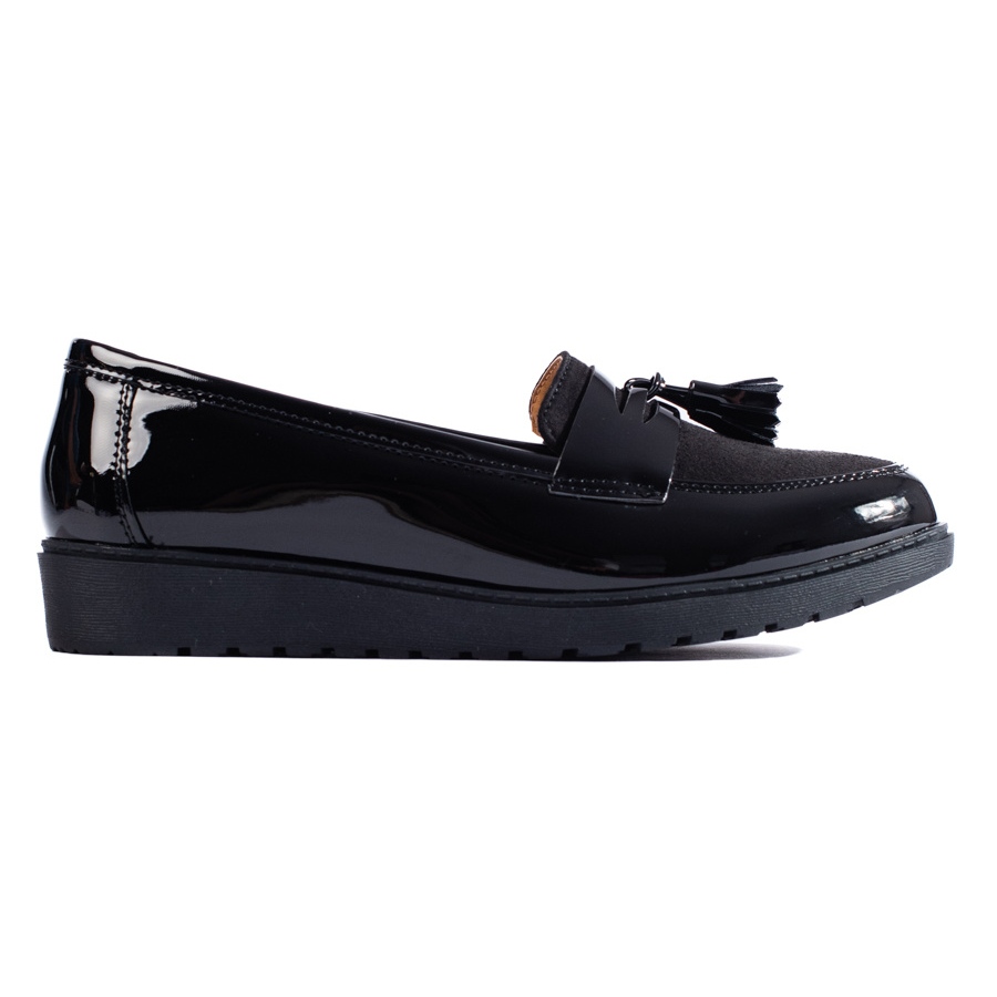 Mokasíny mají 4 cm vysokou platformu, která dodává pohodlí a jistotu na každém kroku. Jejich vnější vrstva je vyrobena z lakované ekologické kůže, která nejenže vypadá elegantně, ale je také odolná a snadno se udržuje. Kulatá špička a třásně vpředu dodávají botám jedinečný charakter a díky klasické černé barvě je lze snadno kombinovat s různými styly.
