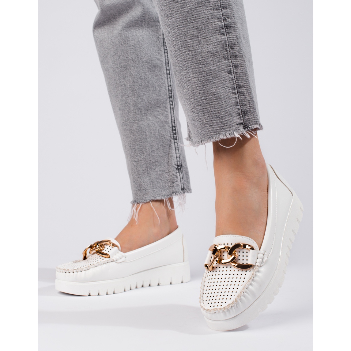 Tyto mokasíny se vyznačují vyvýšenou, měkkou patou a kulatou špičkou, která zajišťuje pohodlí a stabilitu při nošení. 3 cm vysoká podrážka je vyrobena z plastu, díky čemuž je lehká a odolná. Další výhodou je prolamovaný design a ozdobný řetízek, který dodává celku jedinečný charakter.