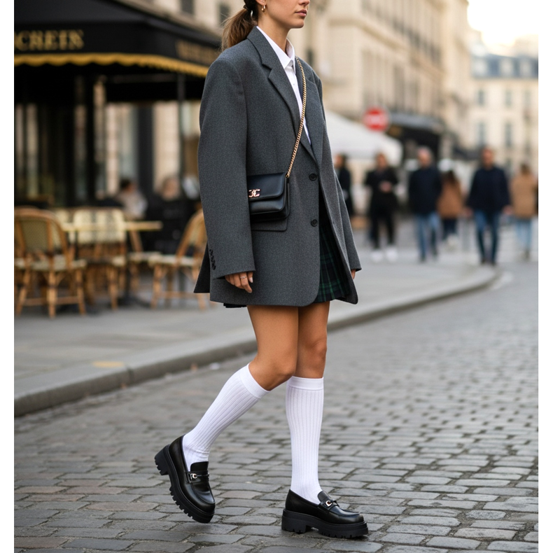Nejoblíbenější a nejstylovější kombinací jsou mokasíny s bílými ponožkami. Tento školní vzhled s moderním nádechem dobývá ulice hlavních měst módy. Zkombinujte je s krátkou kostkovanou sukní a oversize bundou pro dokonalý vzhled. Pamatujte, že ponožky by měly být nedotčené bílé a mírně vyčnívat nad svršek.