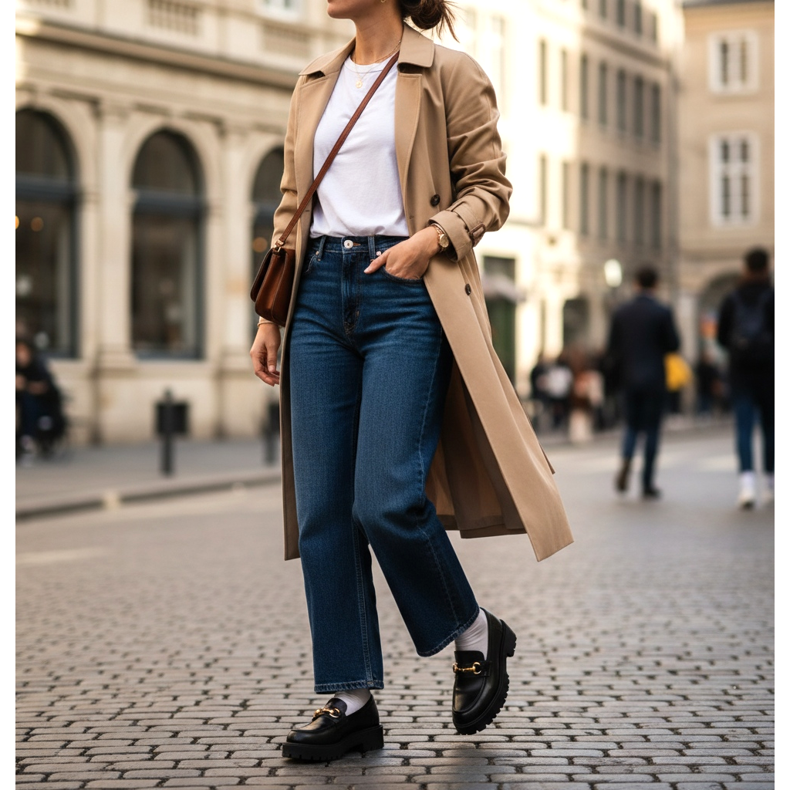 Mohutné mokasíny vypadají skvěle i k džínám. Nejlépe budou fungovat modely s rovnými nebo širokými nohami, které na botě mírně padají. Vyhněte se úzkým džínům – v kombinaci s tak velkými botami mohou narušit proporce vaší postavy. Přidejte jednoduché tričko a trenčkot a máte dokonalý každodenní outfit.