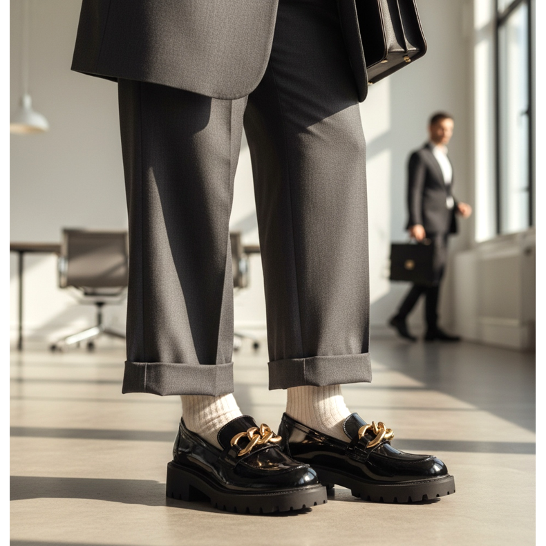 Příznivcům elegance doporučujeme zkombinovat robustní mokasíny s obleky. Vyberte si model se zlatou sponou nebo řetízkem, abyste stylu dodali charakter šperku. Tato sada je pohodlnou alternativou k vysokým podpatkům a bude dobře fungovat v kanceláři (pokud nemáte velmi přísný dress code).