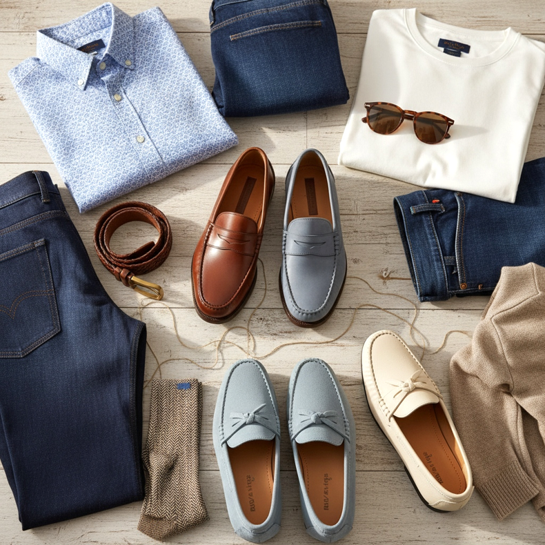 Léto je vrchol mokasínové sezóny. Lehké řidičské boty, perforované modely nebo lehké semišové mokasíny jsou dokonalým společníkem pro teplé dny. Noste je bez ponožek ke šortkám, plátěným kalhotám a letním šatům. Pamatujte jen na správnou hygienu – barefoot boty vyžadují častější větrání.