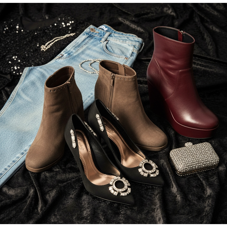 Perfektním řešením budou vysoké podpatky v tlumených barvách, které doladíte ke zbytku outfitu. Pokud se chystáte na večerní párty, můžete zvolit modely s nápadným zdobením – například s krystaly nebo metalickými akcenty.