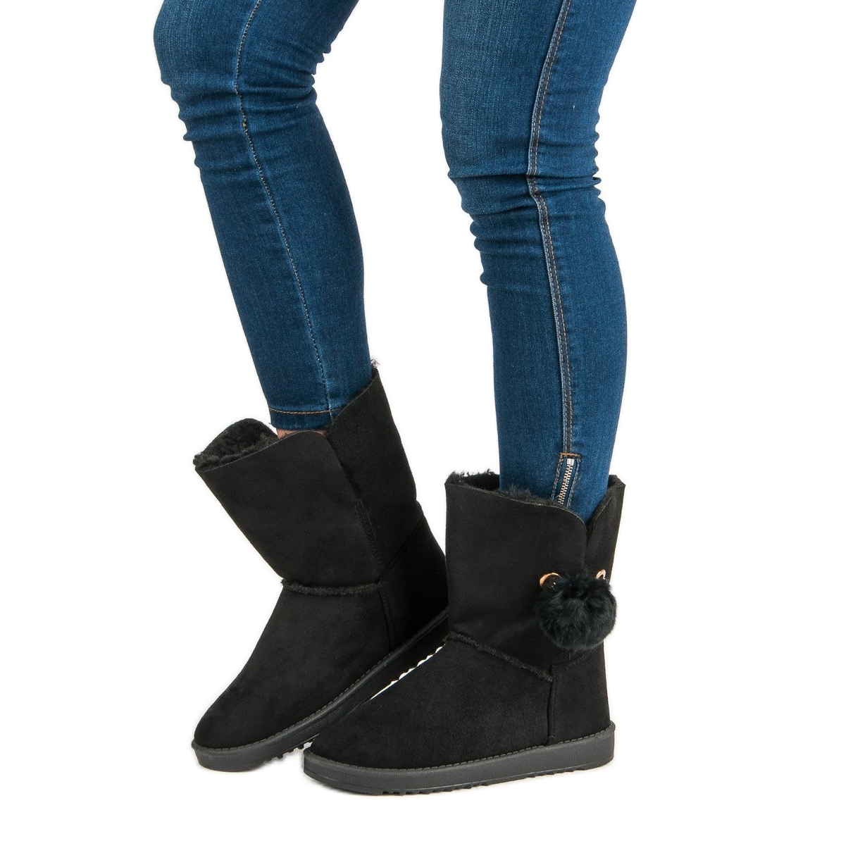 Vnitřek bot byl pečlivě zateplen příjemným ovčím kožichem, což z nich dělá ideální volbu pro chladné dny. Další výhodou jsou okouzlující bambulky, které dodávají celku jemný, ležérní charakter. Mukluky jsou nazouvací, což usnadňuje jejich nazouvání, a díky jejich tlumené černé barvě se hodí k mnoha stylům.