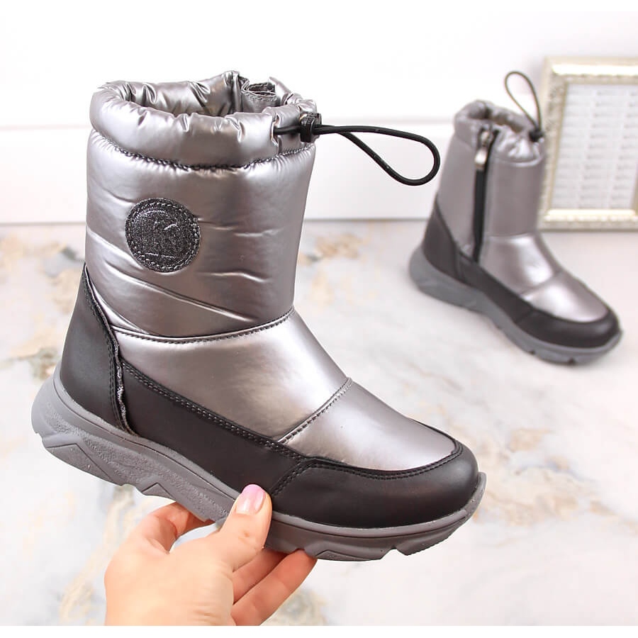 Vodotěsní dívčí sněhové boty Kornecki 6916 - Silver, které kombinuje styl a funkčnost. Perfektní pro zimní dny - lesklý, stříbrný vzhled s černým doplňkem jde dobře s neformálními i elegantnějšími kostýmy. Model ze sbírky Černého pátku 2024.