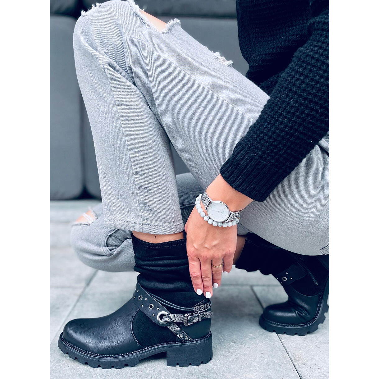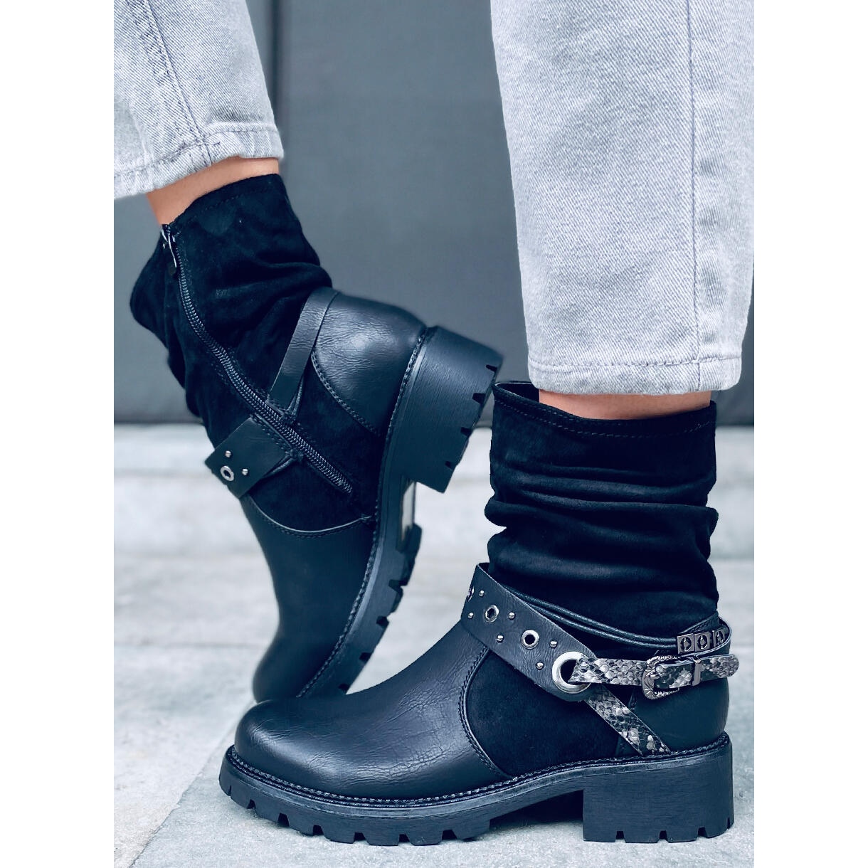 Černé kotníkové boty Lorde s chráničem jsou ideální nabídkou pro ženy, které ocení styl a pohodlí při každodenním nošení. Tyto elegantní, černé kozačky v módním vojenském stylu kombinují vysoce kvalitní ekologickou kůži a ekologický semiš, díky čemuž vypadají mimořádně atraktivně. Opasek s motivem hadí kůže dodává originalitu a jedinečný charakter, který je odlišuje od ostatních modelů.