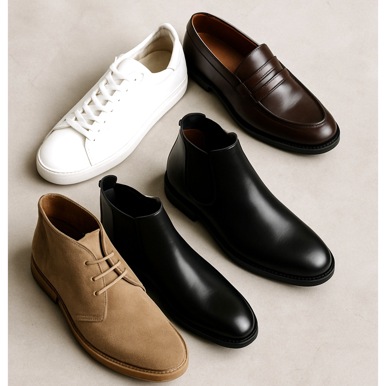 Doporučení: Clarks Desert Boot (klasické), semišová chukka v hnědé nebo šedé barvě.