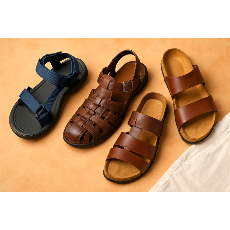 Pánské sandály jsou nejvzdušnější letní obuví, ideální do horkých dnů. Sportovní modely (Teva, Merrell, Keen) s nastavitelnými popruhy a profilovanou podrážkou jsou jako stvořené pro outdoorové aktivity - turistika, kajak, pláž. Minimalistické kožené sandály (Birkenstock, slide sandály) se hodí k ležérním městským stylům - šortky, krátké kalhoty, plátěné kalhoty. Sandály Fisherman vyrobené z tkané kůže jsou elegantní letní variantou středomořského charakteru. Noste je naboso nebo s neviditelnými ponožkami. Vyberte si nastavitelné sandály pro optimální padnutí a pohodlí. Vyhněte se nošení sandálů do kanceláře s formálním dress codem.