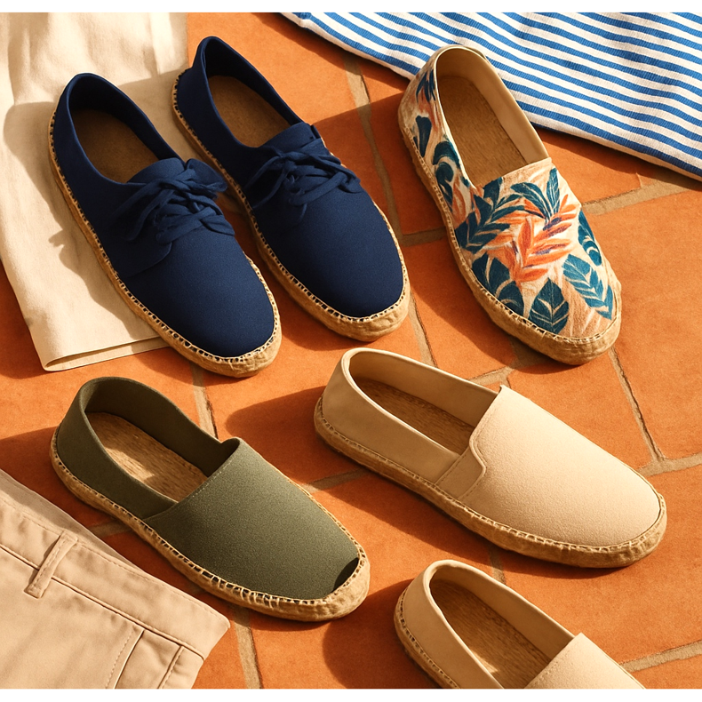 Espadrilky jsou ikonické letní boty vyrobené z plátna nebo lnu s charakteristickou pletenou jutovou podrážkou. Lehké, vzdušné, ideální do horkého počasí. Dostupné v nazouvací formě (bez podpatku nebo s podpatkem), na šněrování nebo s gumičkou. Barvy: klasická béžová, tmavě modrá, khaki a výraznější potisky a vzory. Skvěle se hodí ke krátkým kalhotám, plátěným kalhotám i chino kalhotám v letním ležérním stylu. Oblibu si získaly i espadrilky ve stylu tenisek se silnější gumovou podrážkou – jsou univerzálnější a pohodlnější. Mínus: podrážka z přírodních materiálů není voděodolná a není vhodná do deště. Espadrilky symbolizují středomořskou relaxaci a prázdninový životní styl.