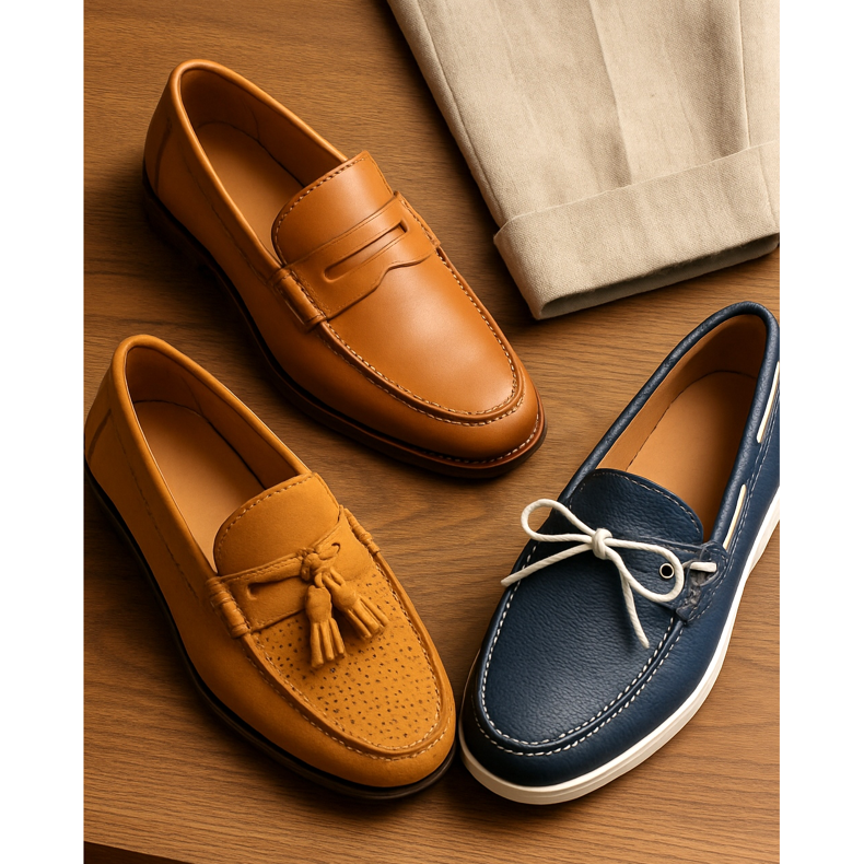 Mokasíny, mokasíny a lodičky jsou elegantní letní obuví bez tkaniček, ideální pro smart casual styling. Penny, střapec a koňské mokasíny v provedení z měkké kůže nebo perforovaného semiše dodávají eleganci se vzdušností. Mokasíny (řidičské boty) s gumovými cvočky na podrážce, měkké a pružné, ideální pro řízení a letní procházky. Lodní boty se šněrováním kolem kotníku, kdysi funkční, nyní stylový prvek ležérního šatníku. Všechny tyto modely lze nosit naboso (kožená podšívka zabraňuje oděrkám) nebo s neviditelnými chodidly. Hodí se k chino kalhotám, plátěným kalhotám i elegantním šortkám.