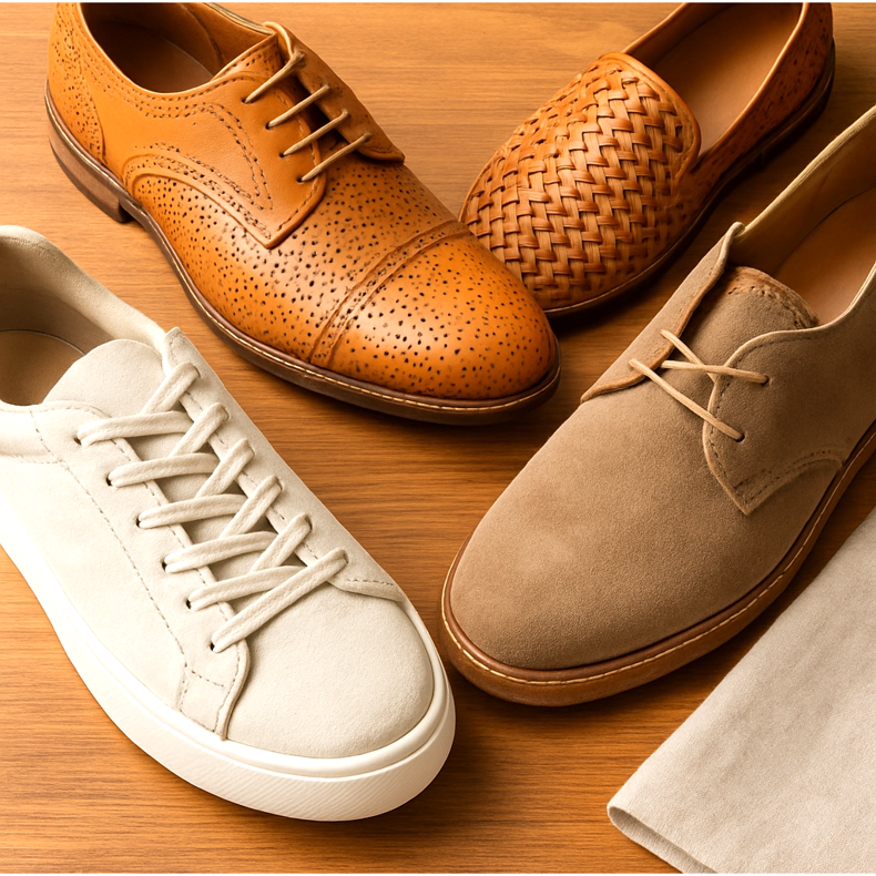 Perforovaná kůže (propichování, dírky) nejen dodává botám charakter, ale také zlepšuje ventilaci. Perforované oxfordky, derby a mokasíny jsou skvělou letní variantou pro formálnější styly. Semiš a nubuková kůže jsou vzdušnější než hladká lakovaná kůže – semišové tenisky nebo pouštní boty se budou dobře hodit v horkém počasí. Lehká lněná nebo bavlněná podšívka místo syntetické zlepšuje tepelný komfort. Modely s otevřenými stranami (open-weave, tkaná kůže) kombinují eleganci kůže s ventilací sandálů. Přírodní gumová nebo korková podrážka je lehčí a vzdušnější než těžká syntetická. Světlé barvy bot (béžová, hnědá, bílá, světle šedá) odrážejí sluneční záření a nezahřívají se tolik jako tmavé.