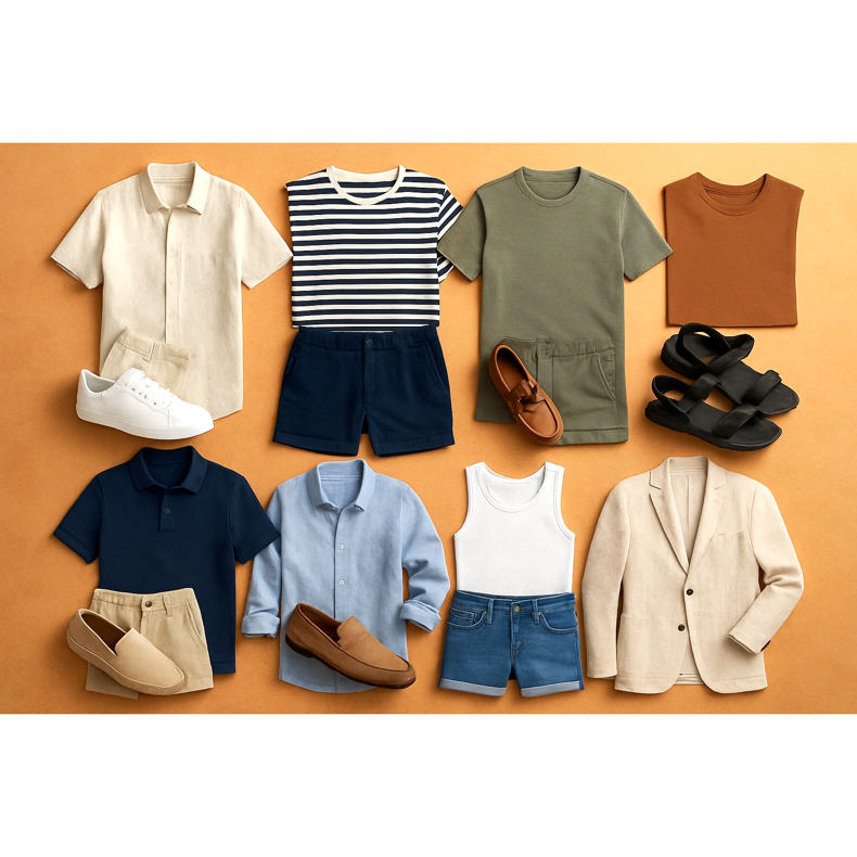 Bílé tenisky + plátěné kalhoty + plátěná košile = klasická letní ležérní elegance. Espadrilky + chino šortky + polo = středomořský prázdninový vzhled. Sportovní sandály + cargo šortky + tričko = outdoorový letní styl. Semišové mokasíny + vyhrnuté chinos + košile s vyhrnutými rukávy = smart casual do teplých dnů. Lodní boty + bílé nebo tmavě modré šortky + pruhované tričko = námořní atmosféra. Plátěné tenisky + džínové kraťasy + tílko = městské streetwear. Lehké mokasíny + plátěné kalhoty + plátěné sako = letní business casual. Nezapomeňte přizpůsobit obuv příležitosti – sandály nejsou vhodné do většiny pracovních prostředí, a to ani v létě.