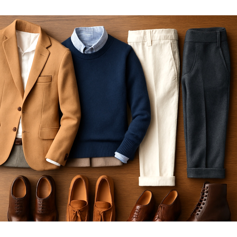 - Letní set — plátěné chinos s manžetami + mokasíny bez ponožek (neviditelné).