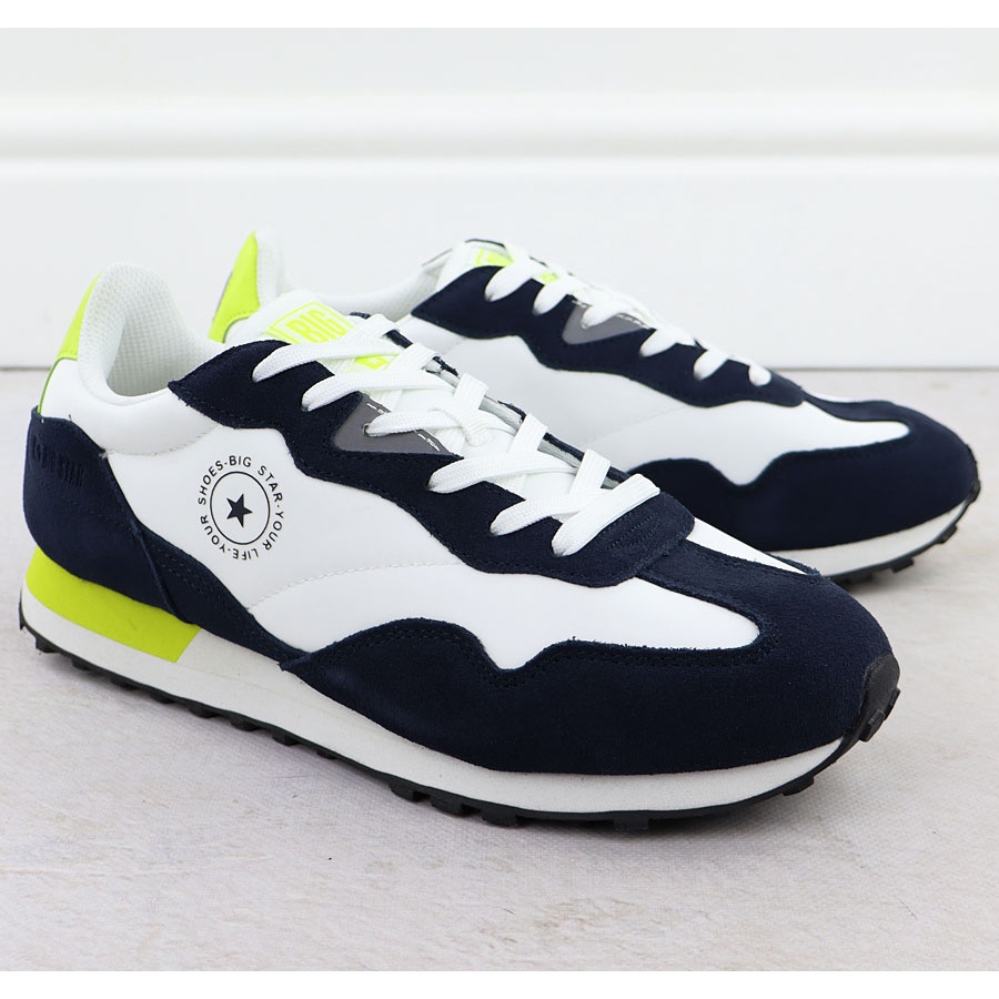 Pánské kožené sportovní boty Sneakers Big Star RR174408 V bílé a tmavě modré je skvělá volba pro muže, kteří si cení stylu a pohodlí. Tyto boty kombinují moderní design a funkčnost, což z nich činí ideální doplněk k každodenním stylizacím.