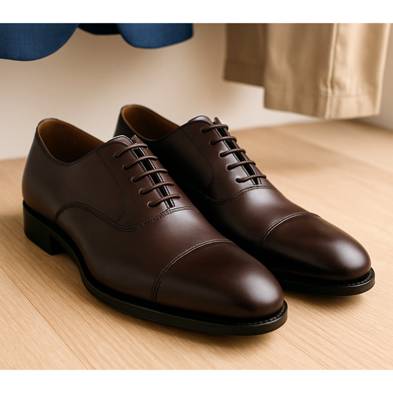 Na svatbu volte boty z té nejkvalitnější kůže – full grain nebo top grain. Kůže by měla být hladká, bez viditelných vad a dobře upravená. Vyhněte se reliéfní kůži imitující texturu a ekokůži – vypadají lacině. Podrážka by měla být kožená nebo kvalitní guma (o něco pohodlnější). Zkontrolujte zpracování: rovnoměrné švy, dobře připevněná podrážka metodou Goodyear welted nebo Blake. Vnitřek boty by měl být kožený – zajišťuje lepší ventilaci při dlouhém obřadu.