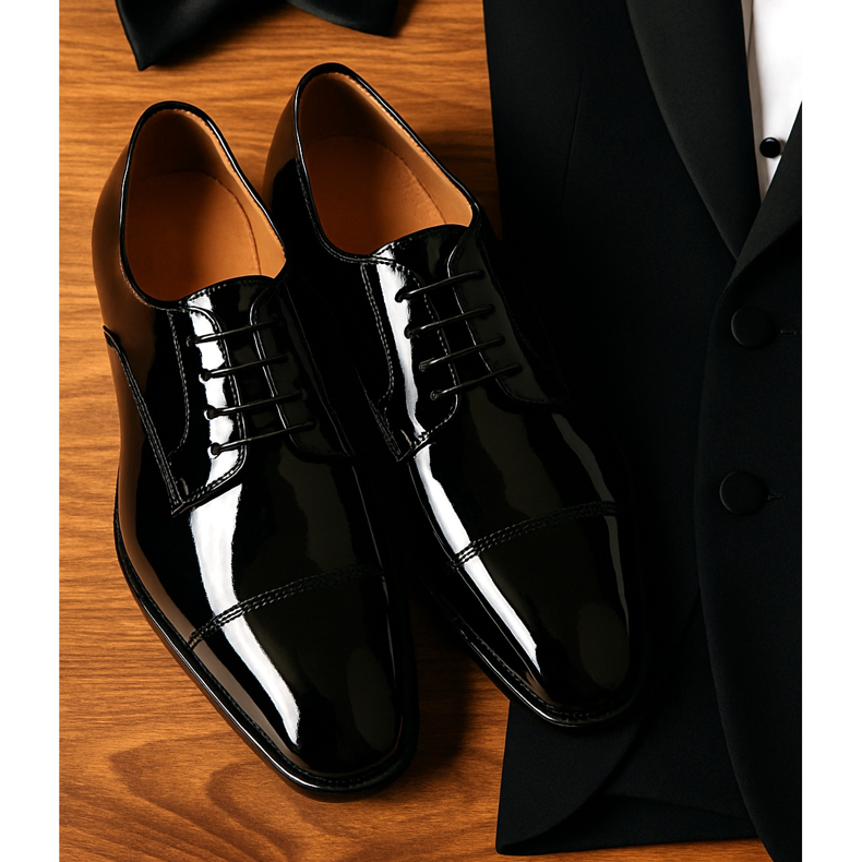 Lakovaná pánská obuv (lakovaná kůže) je variantou vyhrazenou pro dress code white tie nebo black tie. Černé lakovky ladí pouze ke smokingu nebo fraku. Nenosíme je k běžnému obleku nebo na typickou svatbu s poloformálním nebo koktejlovým dress codem. Pokud svatební oznámení jasně specifikuje velmi formální charakter (gala, black tie) - budou vhodné lakované boty. Jinak volte klasické matné oxfordky, které jsou univerzálnější a elegantnější, aniž by byly nad věcí.