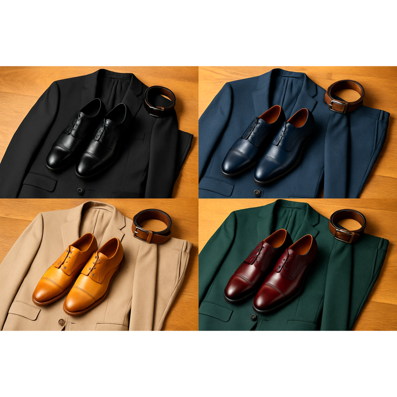 Základní pravidlo: černé boty ladí s černými, tmavě modrými, uhlovými a tmavě šedými obleky. Hnědé boty (od světle hnědé přes koňakovou až po tmavě hnědou) se hodí k béžovým, světle šedým, modrým a zeleným oblekům. Nikdy nekombinujte černé boty s hnědým páskem nebo hnědé boty s černým páskem - pásek a boty musí být stejné barvy. Vínové boty (oxblood, burgundy) jsou univerzální alternativou – hodí se k tmavým i světlým oblekům. Vyhněte se světle hnědým botám pro velmi formální svatby.