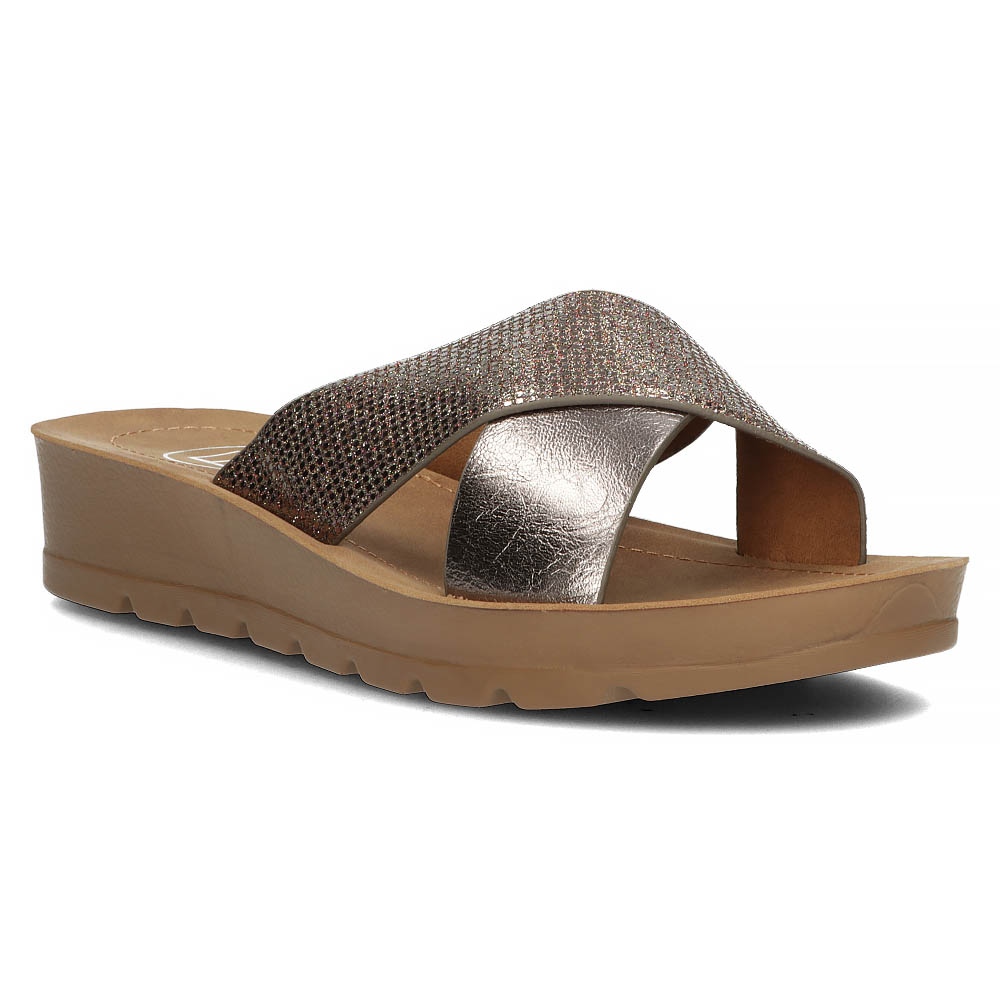 Tento model se vyznačuje kulatou špičkou a 4 cm vysokým klínem, který dodává nejen pár centimetrů na výšce, ale také na eleganci. Podešev z plastu a stélka z ekologické kůže zajišťují pohodlí při používání a dodatečné metalické vlastnosti dodávají každému letnímu stylingu jemný styl.