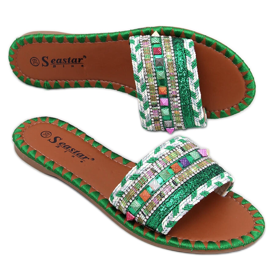 Tyto žabky vyrobené z vysoce kvalitní látky jsou nejen módní, ale také pohodlné na nošení. Díky absenci špičky jsou vzdušné, což z nich dělá perfektní volbu pro teplé dny. Zelená barva a vzorované ozdoby s kamínky a cvočky jim dodávají na originalitě a jsou tak dokonalým doplňkem každodenního stylingu.