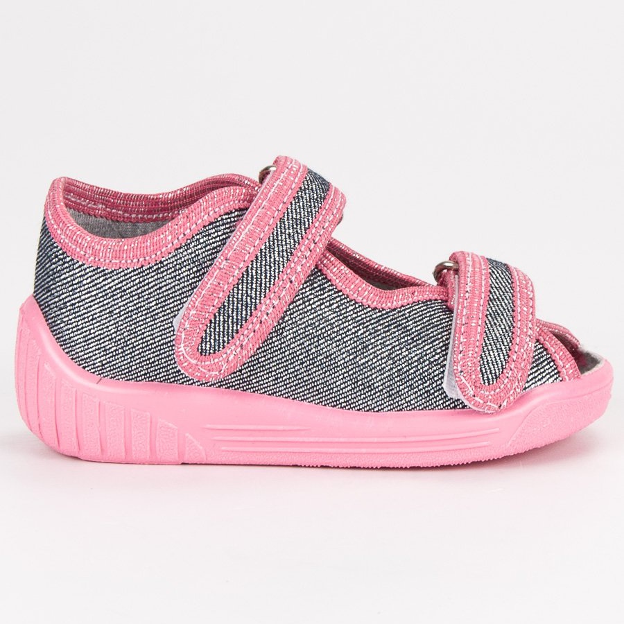 Šedo-růžové pantofle na suchý zip Butymodny je návrh pro dívky každý den, do školy, mateřské školky nebo dvorku. Byly vyrobeny z textilního materiálu. Uvnitř je vložka z přírodní kůže, která poskytuje pohodlí při používání. Pryžová podešev má neklouzavý běhoun.