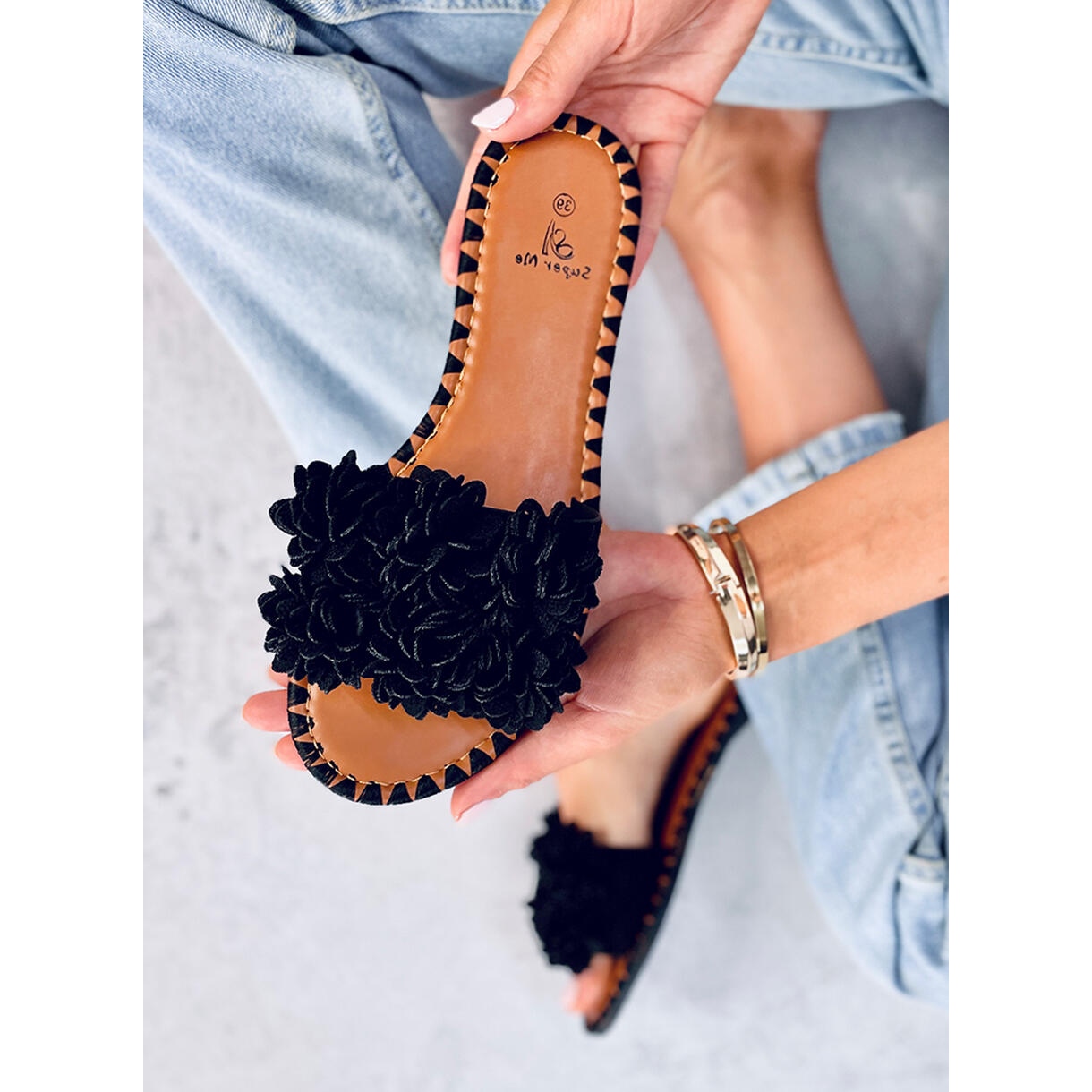 Vyrobeno z ekologického semiše zaručuje nejen potěšení z nošení, ale také povědomí o výběru ekologicky šetrného výrobku. Černé žabky zdobí jemné, květinové aplikace, které upoutají pozornost a dodají lehkost každému stylingu. Díky tomu mohou být skvělým akcentem každodenních outfitů, jak ležérních, tak lehce elegantních, letních šatů.