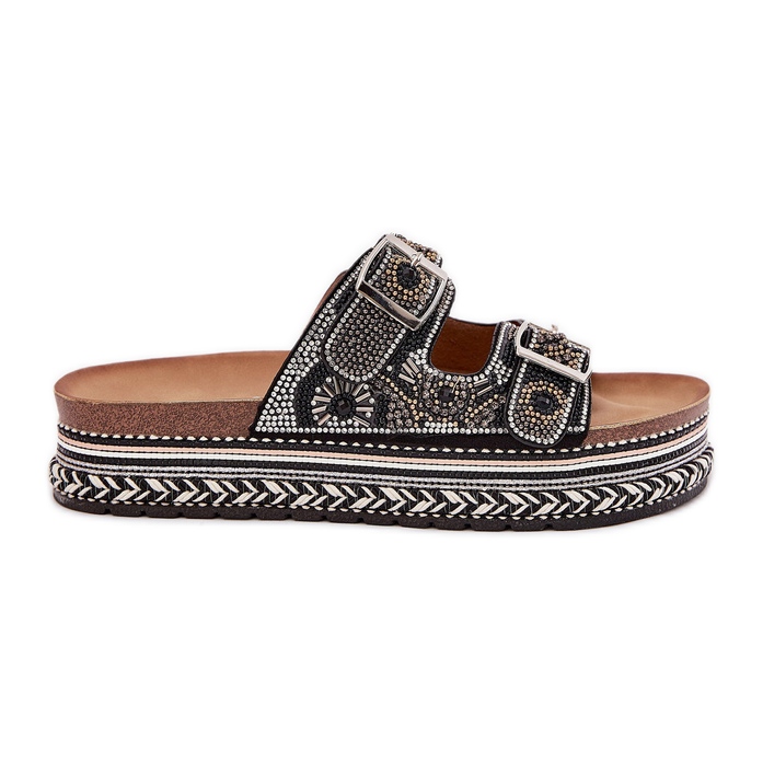 Pantofle s dekorací a spony na černé platformě černý