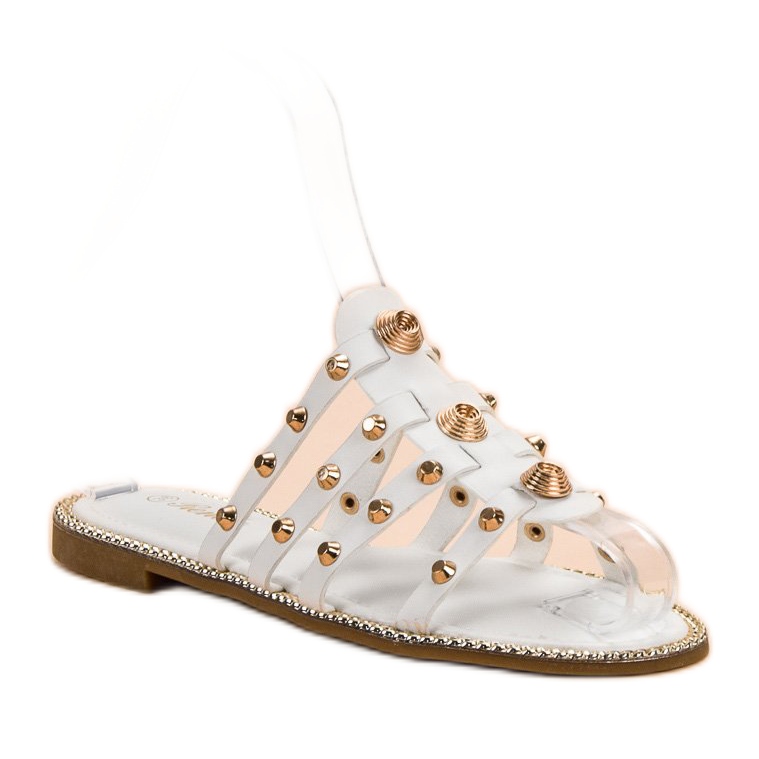 Bílé žabky Renda s kamínky jsou perfektní volbou pro ženy, které chtějí spojit pohodlí s módním stylem. Tyto žabky zdobené zlatými kamínky a cvočky budou perfektním doplňkem k ležérním rockovým stylům. Vyrobeny z vysoce kvalitní ekologické kůže, zajišťují dostatečné větrání nohou v horkých dnech a zároveň zaručují komfort nošení.