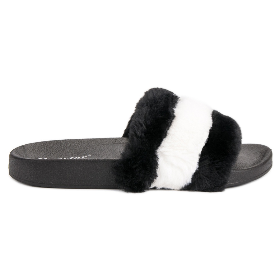 Žabky Seastar With Fur, černé, jsou perfektní volbou pro ženy, které si cení pohodlí a stylu doma. Tyto slip-on skluzavky se vyznačují nejen elegantní černou barvou, ale také originální kožešinou s bílými a černými pruhy, která jim dodává jedinečný charakter. Vyrobeny z kvalitní gumy, zaručují odolnost a pevnost, takže dlouho vydrží.
