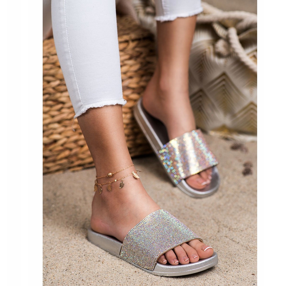 Přední část svršku je zdobena drobnými krystaly, které se na světle efektně třpytí a dodávají žabkám jedinečný charakter. Díky měkké gumové stélce a nášlapné plastové podrážce se chůze v nich stává čistým potěšením. Nízká platforma vysoká 2 cm zajišťuje nejen pohodlí, ale i stabilitu při používání.