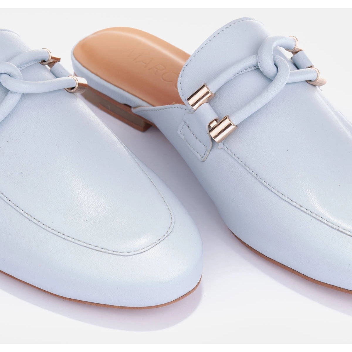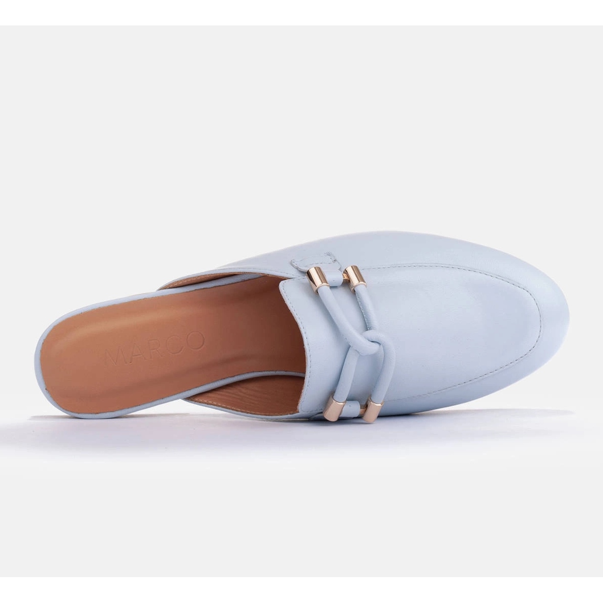 Dámské pantofle Marco Shoes jsou módní, každodenní obuv v modré barvě. Jsou vyrobeny z přírodní lícové kůže, která jim dodává elegantní vzhled a pohodlí. Kožený interiér a stélka zdůrazňují jejich vysokou kvalitu. Pantofle mají malý podpatek - 1 cm, vyrobené z kvalitního materiálu. Ze stejného materiálu je vyrobena i podrážka, která zaručuje dostatečné odpružení a odolnost. Boty mají kulatou špičku, která zajišťuje komfort nošení bez ohledu na tvar nohy.